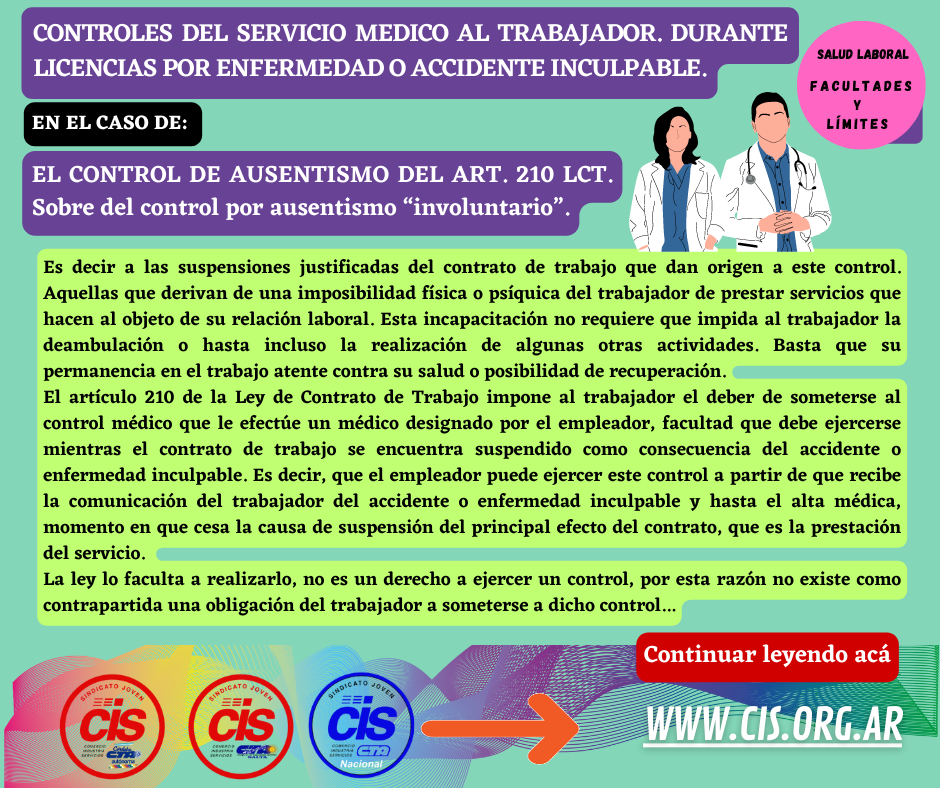 Los controles médicos al trabajador constituyen una facultad del empleador, no un derecho, incluyendo dentro de esta categoría los exámenes…