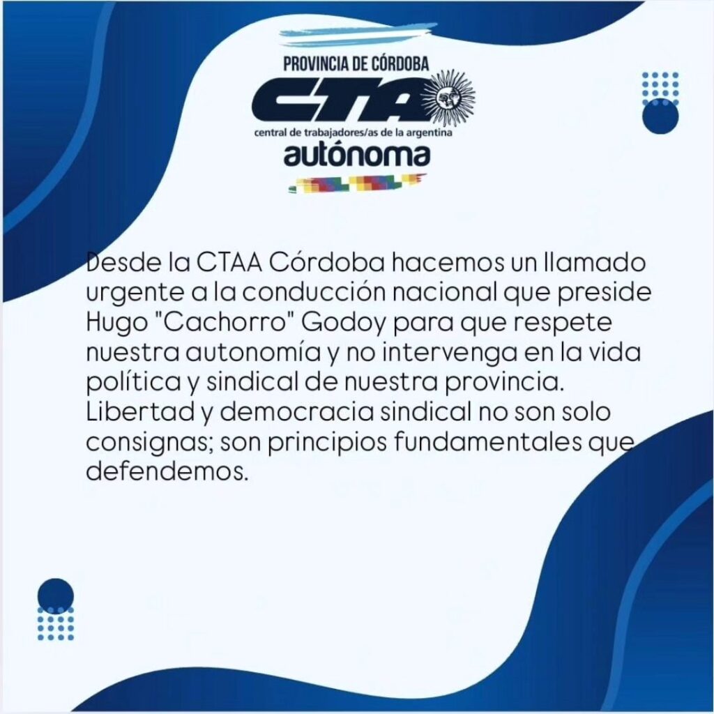 “Desde la CTAA Córdoba hacemos un llamado urgente a la conducción nacional que preside Hugo «Cachorro» Godoy para que respete nuestra autonomía y no intervenga en la vida política y sindical de nuestra provincia. Libertad y democracia sindical no son solo consignas; son principios fundamentales que defendemos.” concluye el comunicado.