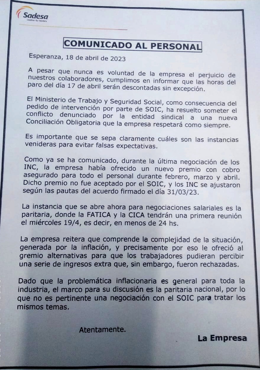 En horas del mediodía de ayer el ministerio de trabajo local decretó la conciliación obligatoria y programó una audiencia para este miércoles 19 de abril, al mismo tiempo que la cámara de empresarios curtidores con la federación sindical acordaron reunirse el mismo día, en un intento de bajarle el precio a la negociación local en Esperanza, tal como lo hace evidente el comunicada con el que la empresa Sadesa empapeló sus carteleras internas. En ese mismo comunicado la patronal hace referencia a una supuesta oferta de mejora salarial que había ofertado, que en realidad se trataba de un plus a cambio de más producción. “Aprovechar los tiempos muertos” dijeron. Una avanzada que también se intenta introducir en la planta Sadesa Lomas de Zamora, allí es cambio de ninguna mejora salarial.